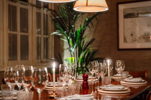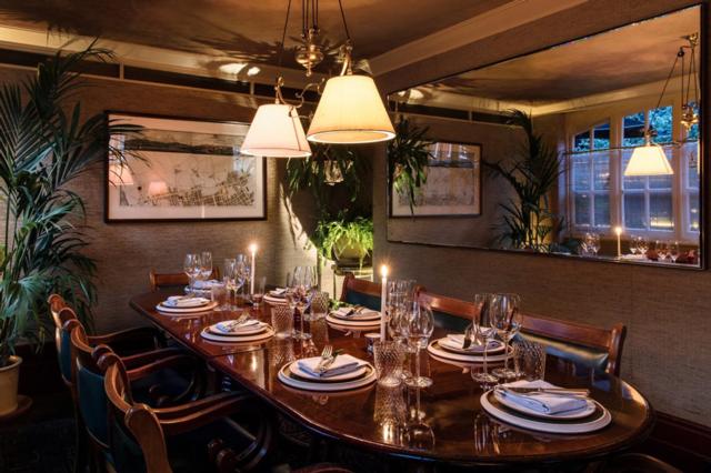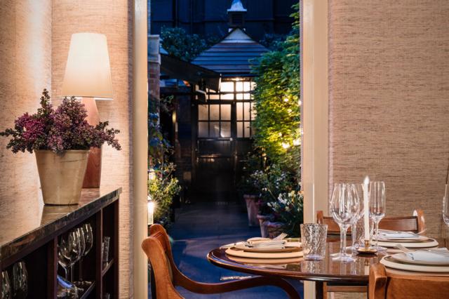 Description: The Garden Room at Chiltern Firehouse in the heart of Marylebone seats up to 12 on a wooden table.